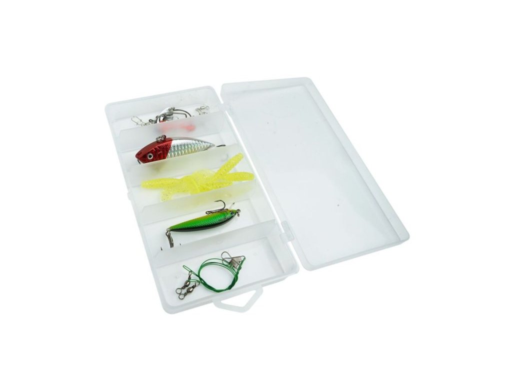 Transparentní krabička na příslušenství vám pomůže mít vše potřebné pěkně uspořádané a na dosah. 2ks držák na prut, poslouží při odkládání nebo odpočinku.K bezpečnému a efektivnímu odstranění háků z úst ryby bez poškození slouží plastový uvolňovač háků. Set obsahuje také množství příslušenství pro lov dravců, jako jsou například jigové hlavičky, háčky, nástrahy, ocelová lanka nebo woblery.