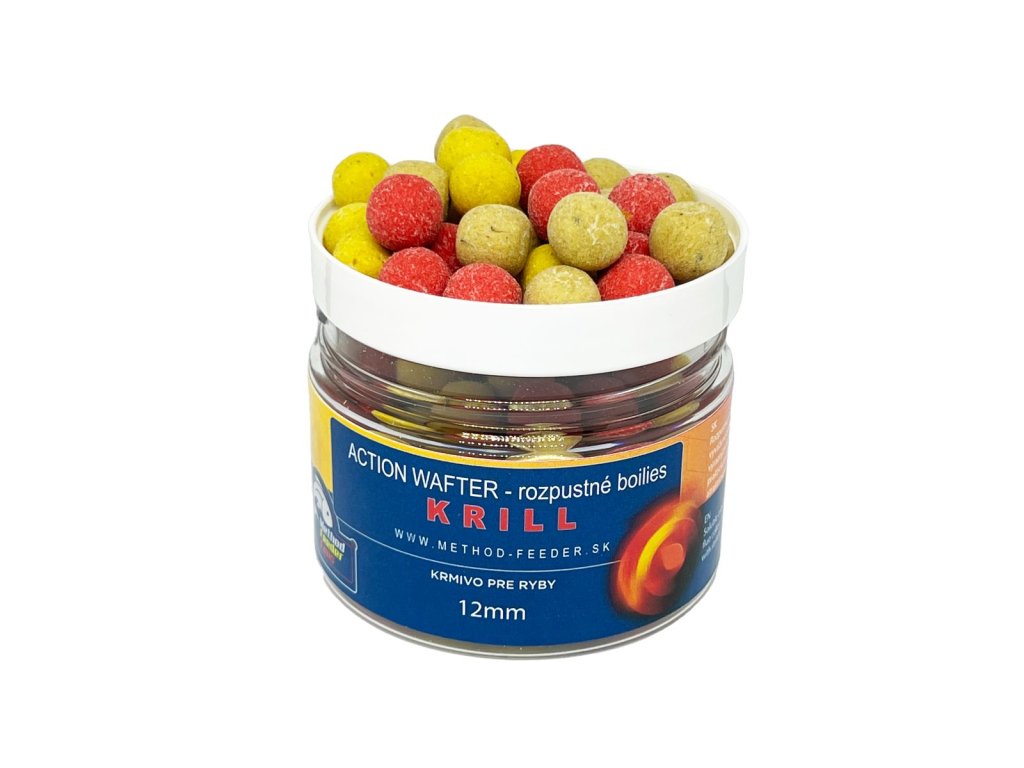 Do portfolia Method Feeder Fans přibyl produkt, který nám chyběl, Action Wafter 12mm – neutrálně vyvážené rozpustné boilies. Znamená to, že je přibližně stejně těžké jako voda. Po vhození do vody plave, avšak při použití správné velikosti háčku se chová neutrálně. Action Wafter jen jemně zvedne špičku háčku ze dna, avšak celý návazec zůstává potopen. Rybě, která nasává návnadu v okolí krmítka, se snadno dostane do úst. Taková sestava je nenápadná a působí přirozeně.