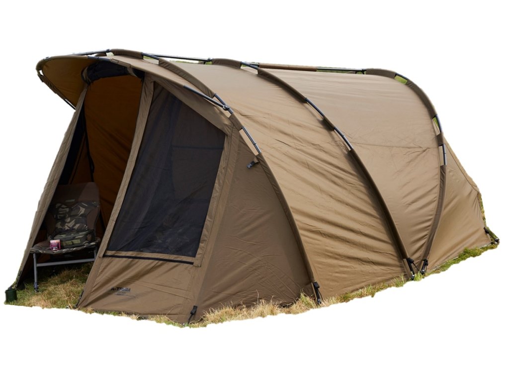 Velký bivak pro dva rybáře a dvě lehátka s prostornou předsíňkou a kšiltem proti dešti a slunci.