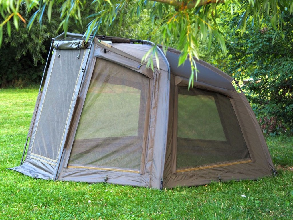 Bivak je dodáván s praktickou transportní taškou na zip, odnímatelnou silnostěnnou zip PVC podlahou a nerezovými zavrtávací a zatloukacími kolíky.