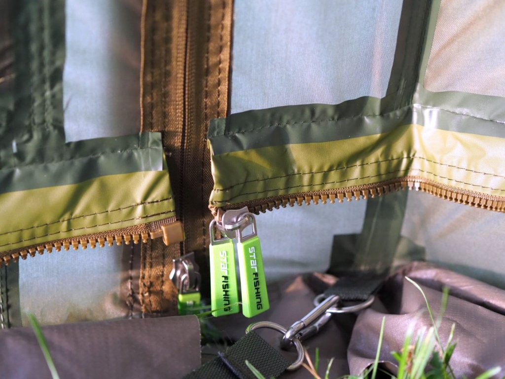 - přední strana bivaku nabízí tři možnosti nastavení, moskytiéra, plný panel a slídové okno