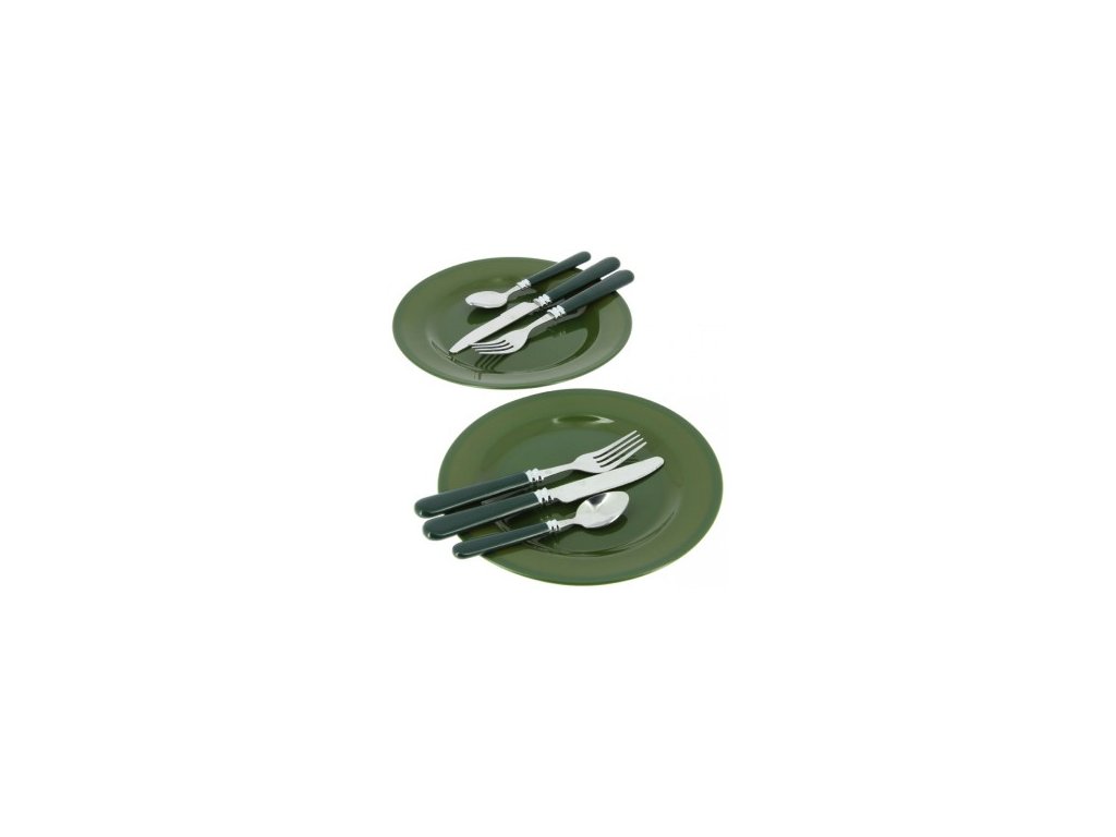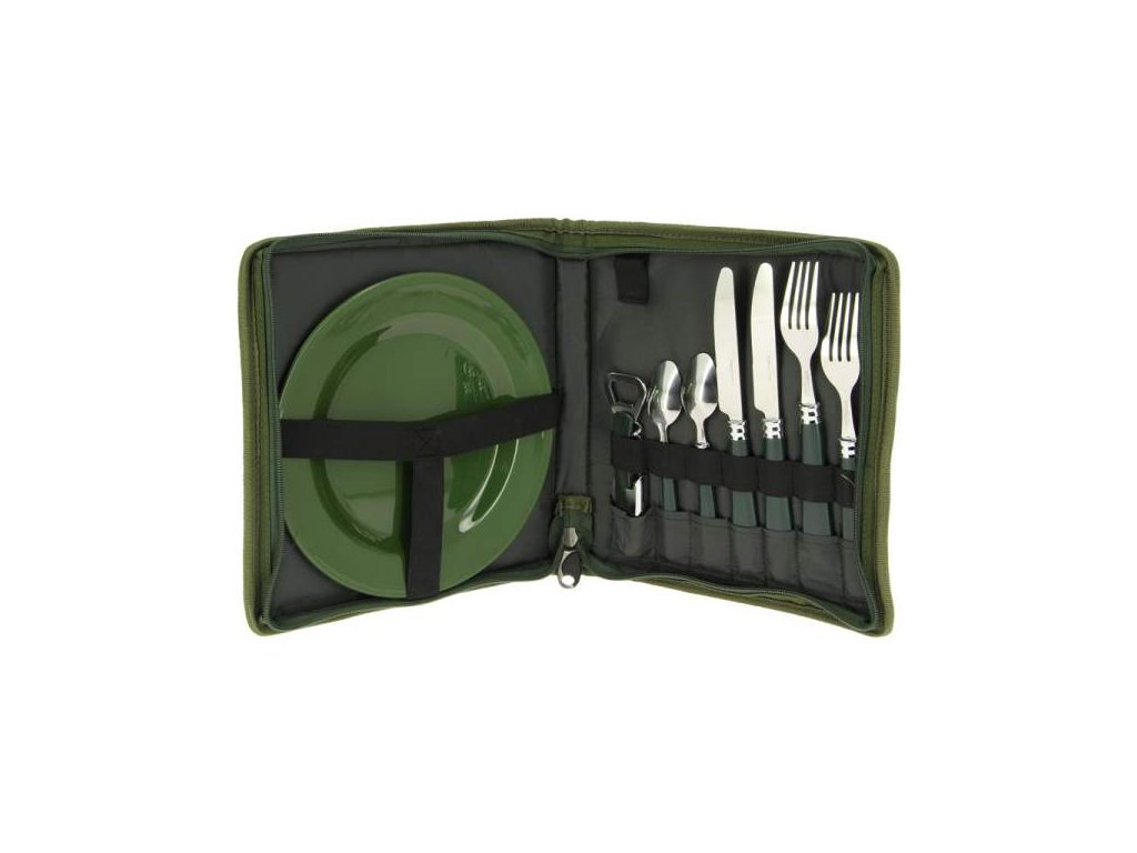 Jednoduchá jídelní sada pro kempování. Vhodná nejen pro rybaření. Jen 4 cm silná, takže nezabere mnoho místa. Obsah jídelní sady je chráněn dobře polstrovaným obalem z pevné tkaniny.
