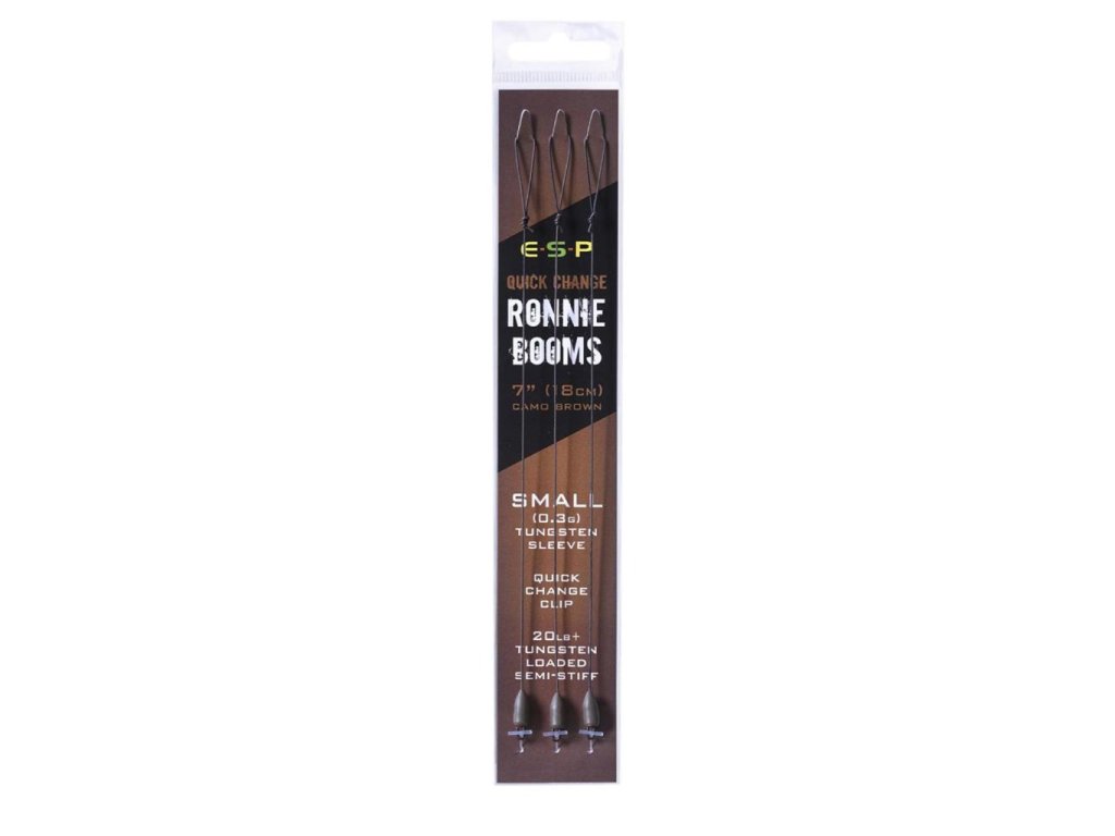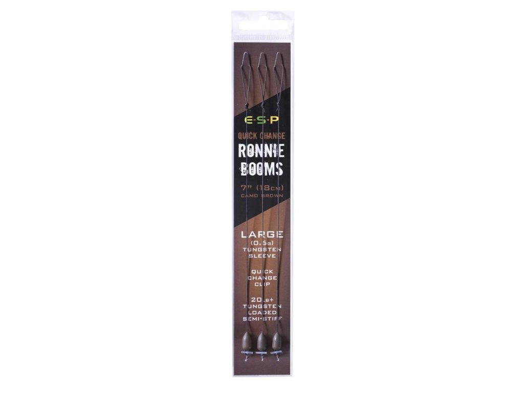 ESP Quick Change Ronnie Boom Tento dokonale navázaný návazec s délkou 7" (18 cm) je navržen tak, aby perfektně doplňoval návazce typu Ronnie a Hinge Rig. Umožňuje rychlou a snadnou výměnu háčku a zároveň obsahuje tungstenovou objímku, která díky své váze spolehlivě přitáhne celý návazec ke dnu. Tungstenové objímky představují ideální alternativu k plastickému olovu (tmelu) a jsou mnohem odolnější vůči pozornosti raků. Návazec je vyroben z potahované ztužené šňůrky Loaded Semi-Stiff, což zajišťuje optimální prezentaci. Na konci návazce je vytvořena osmičková smyčka pro snadné připevnění k obratlíku kmenového vlasce. Dostupné barvy: Weedy Green, Camo Brown a Silt Grey. Gramáž tungstenové objímky: 0,3 g a 0,6 g. Zvolená gramáž je vhodná pro různé velikosti háčků a plovoucí nástrahy. Balení: 3 ksDoplňkové parametry