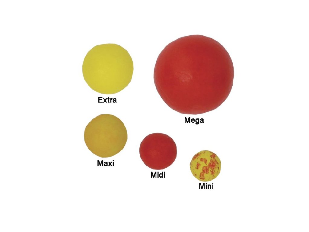 Paleta rozměrů: Mini: K lovu cejnů, k sendviči kostních červů, Midi: k lovu kaprů, k lovu ze dna. Maxi: s boilies a k vznášení malé rybky, Extra: k lovu sumců, k lovu ze dna s krevní tabletou. Výběr příchutí: natur, vanilka, anýz, kapr Mix, cejn, med, jahoda, mušle, Barevná mega varianta je ideální pro například: na vznášení boilies.