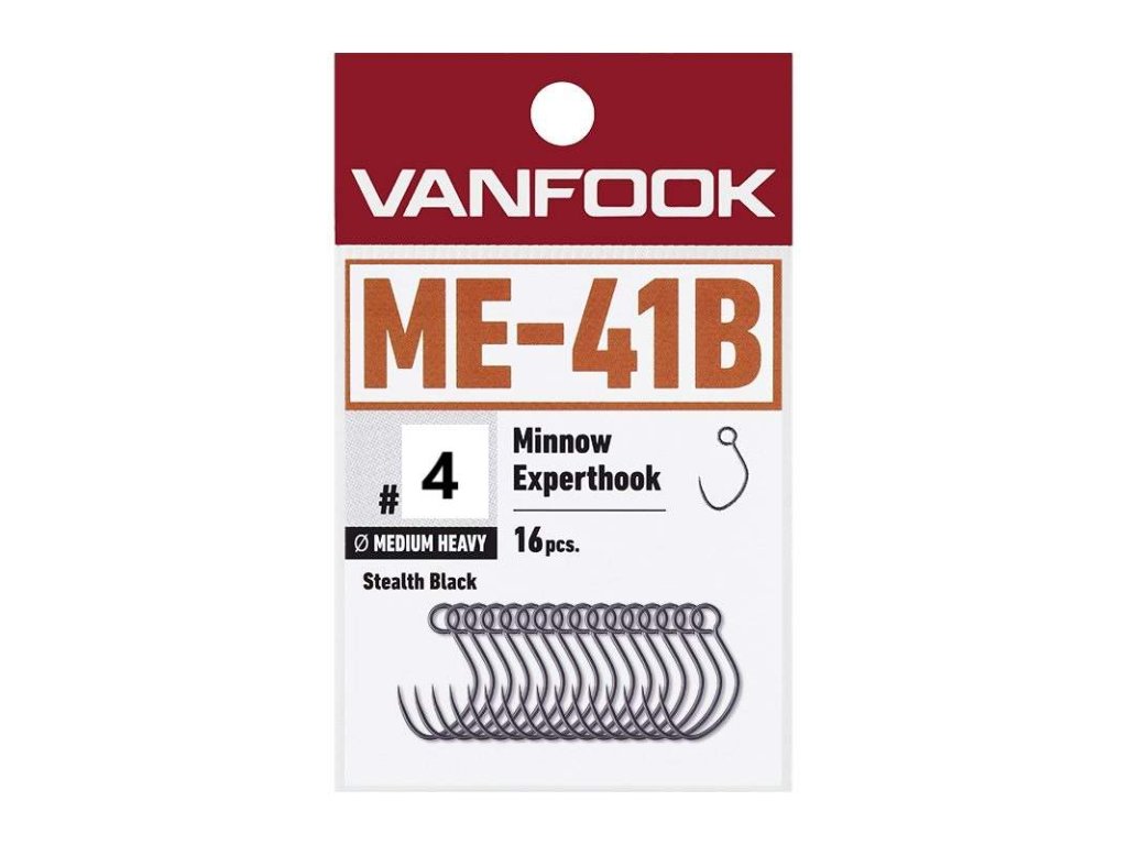 ME-41B minnow experthook Háček na woblery minnow s vysokou tvrdostí se zvláštním tvarem ME-41B má zvláštní formu navrženou tak, aby omezila předpokládané problémy při lovu jako je vzájemné zamotávání, zaháknutí vlasce atd. Použití středně těžkého drátu, silnějšího než ME-31BL, zajišťuje spolehlivý boj i s velkými rybami. Háčky nemají protihrot a díky tomu minimalizují požkození ryb a umožnují lov chyť a pusť. V balení 16ksDoplňkové parametry