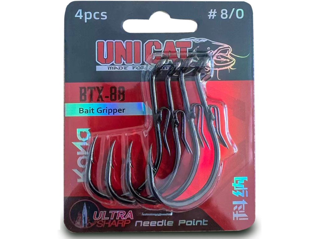 Háčky Uni Cat BTX 88 Bait Gripper jsou extrémně robustní a pevně sedící sumcové háčky, které jsou ideální pro aktivní i pasivní lov sumců s nástražními rybami. Díky hrotům na zadní straně háčku je možné háček pevně fixovat do nástrahy tak, aby ostrý hrot agresivně vyčníval. Hladký povrch zajišťuje snadný průnik a minimalizuje poškození nástrahy.