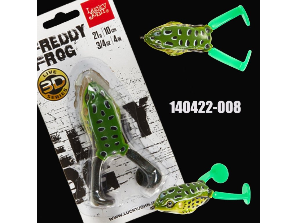FREDDY FROG je pravá imitace žáby se dvěma nohami a silným dvojhákem, který je integrován do těla tak, aby se nástraha neustále nezamotávala při vedení zarostlým terénem. Měkký pryžový povrch nástrahy Lucky John – FROG je určen pro rybaření v nejtvrdších podmínkách, v silně zarostlých vodních plochách, kde není možné použití jiných nástrah. Hlavní cílovou rybou je štika. Hlavní způsob navádění — lehké škubání návnady v krátkých intervalech 1-1,5 sekundy. Úder by neměl být prováděn ukvapeně, aby se předešlo nízké účinnosti zákusů. Proto se doporučuje následující schéma. Když uvidíte, že štika žábu prakticky chňapla, nevytahujte jí návnadu zpod nosu ani z tlamy. Naopak byste měli šňůru povolit, počkat 1,5-2 sekundy a teprve potom provést akcentovaný úder.Doplňkové parametry