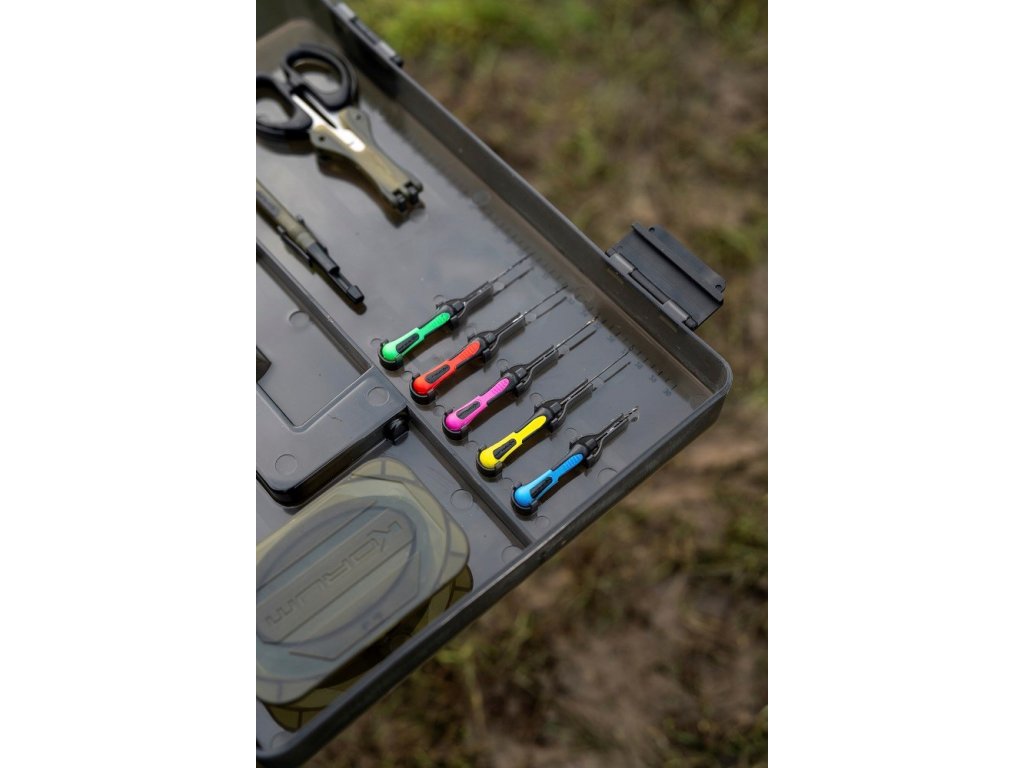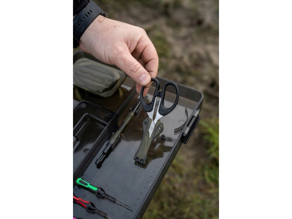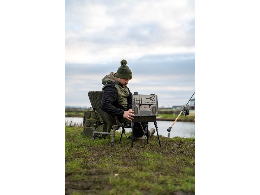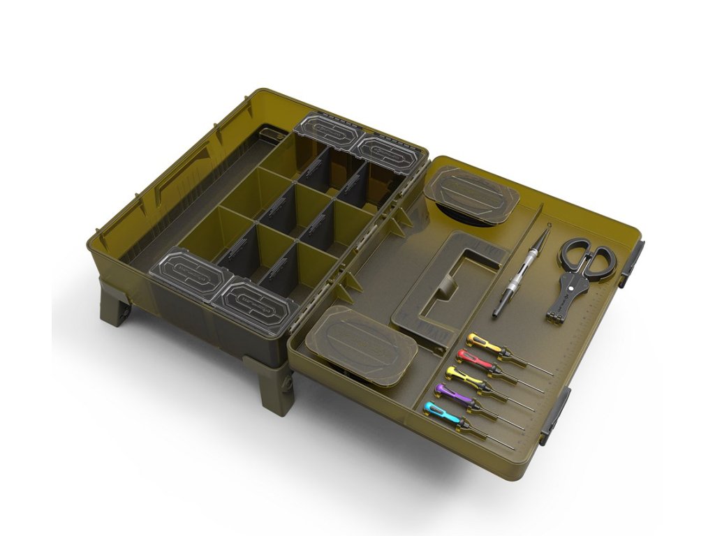 Vaše nástroje na krmení, odháčkovávač a nůžky se pohodlně zakliknou na své místo, zatímco hlavní část boxu lze upravit pomocí přepážek podle vašich potřeb. Víko obsahuje dva mělké RIG BLOX, které uchovají všechny vaše předvázané návazce v bezpečí před vlivy počasí.