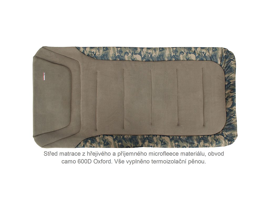 Ploché lehátko Royal King Camo poskytuje velmi vysoký komfort, který bude konkurovat i spaní, které máte doma. Royal King Camo je šestinohé ploché lehátko (bez kloubu) se stabilitou osminohého lehátka. Unikátní rozložení tří páru noh umožňuje sezení po celé délce lehátka. Nohy mají aretaci proti sklopení. Střed matrace je s micro fleece a po obvodě camo 600D Oxford a to celé vyplněno termoizolační pěnou. Matrace s polštářem je na konstrukci v prostřední části vyztužena pro větší pohodlí. V transportní poloze je lehátko fixováno popruhem. Lehátko Royal King je nyní uzpůsobeno tak, aby se pohodlně vešlo do kufru vašeho auta.