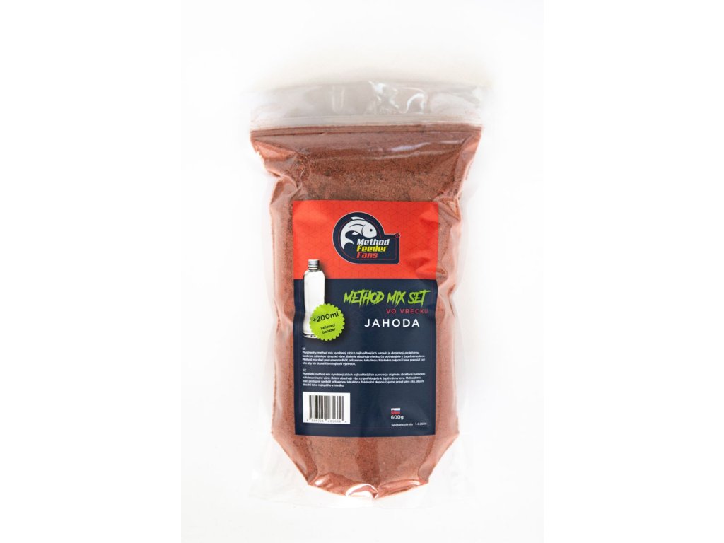 Příchuť jahoda je složená z 11 komponentů: kukuřičný šrot extra, pražený kukuřičný šrot, více druhů mletých sušenek, mleté ??CSL pelety, mleté ??anglické vločky, jahodové mikro peletky, slunečnicová semínka, řepka, arašídy, tygří ořech a rybí moučky. Má příjemnou sladkou chuť a výraznou červenou barvu. Jedná se o celoroční method mix. Jeho výběrem nic nezkazíte v žádném ročním období a je zaměřen na obecný lov jakýchkoli ryb.