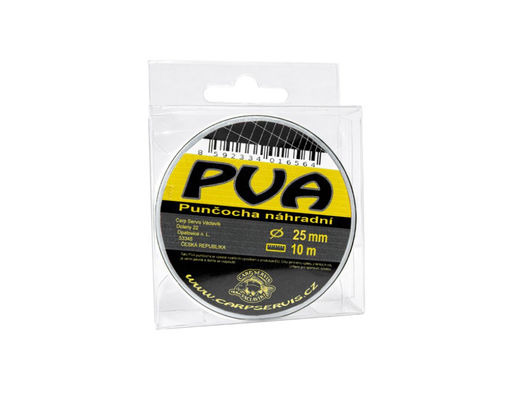 Naše PVA punčochy jsou vysoce kvalitním výrobkem z produkce EU. Díky jemnému úpletu z tenkých nití je velmi pevná a dobře se rozpouští. Rozpustnost je zaručená i v chladném období roku. V případech, kdy je potřeba rozpustnost PVA materiálů zpomalit, což zpravidla bývá při lovu ve velkých hloubkách nebo na průtočných vodách, doporučujeme naplněnou punčochu ponořit do Boosteru nebo CSL Cornkiller. Tímto krokem se značně zpomalí rozpustnost PVA až na cca 2 min. a zároveň se značně zvýší atraktivita nástrahy. - Balení: 10 m - Průměr: 25 mm Výrobce: CSVDoplňkové parametry