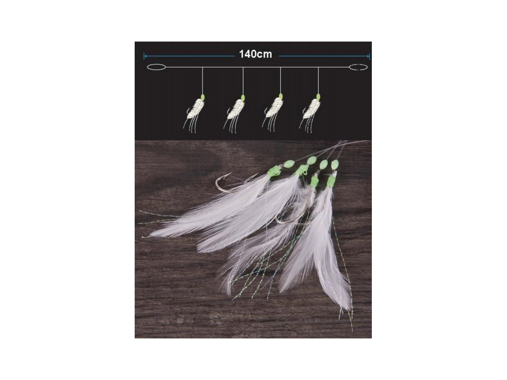 Systém pro lov makrel se čtyřmi háčky. Bílá barva je lákavá. Nad háčkem jsou fluorescenční korálky a na háčku je bílé peří se stříbrnými střapci. Součástí balení je EVA Board - pěnová deska na návazce.