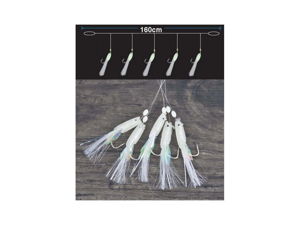 Systém pro lov makrel s pěti háčky. Nad háčkem jsou bílé korálky a na háčku je bílá imitace rybí hlavičky a fluorescenční folie s bílými střapci. Součástí balení je EVA Board - pěnová deska na návazce.