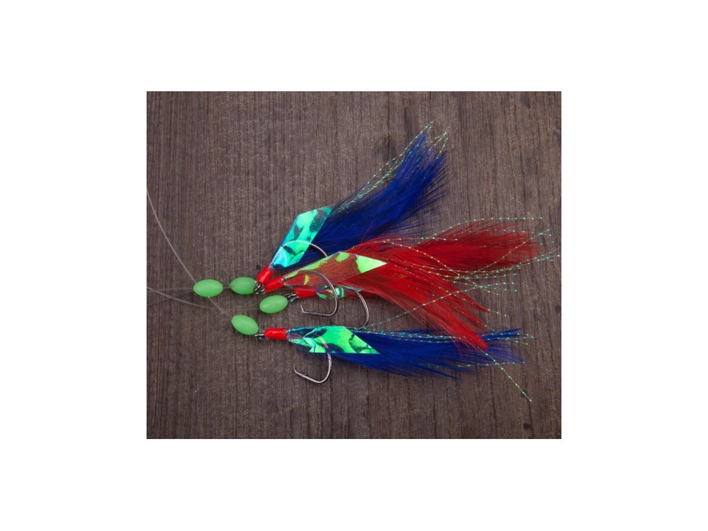Systém pro lov makrel s třemi háčky. Nad háčkem jsou fluoro korálky a na háčku fluorescenční folie s barevnými střapci.