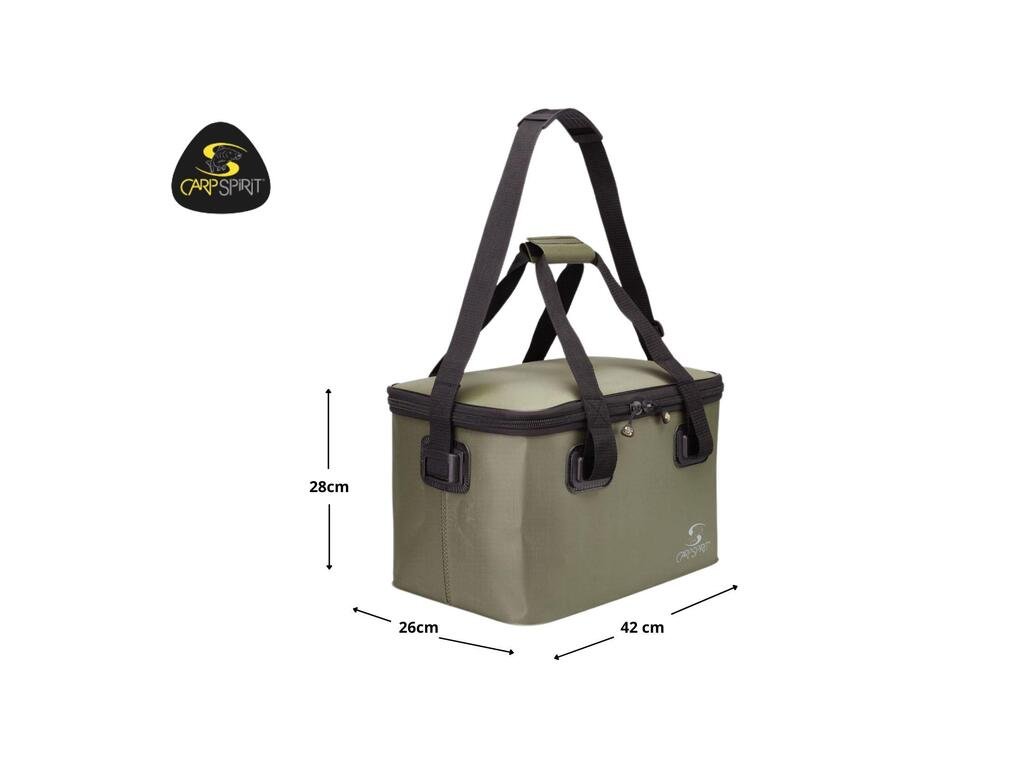 Carp Spirt Bakkan je víceúčelová voděodolná taška vyrobená z EVA materiálu s víkem na zip a vodotěsným dnem. Objem 30 litrů Konstrukce z EVA materiálu s tloušťkou: tělo 1mm, dno 1,5 mm, víko 0,85 mm Ideální taška na ochranu nezbytných věcí před vnější vlhkostí Zesílené rukojeti a poruh Plastový zip ve velikosti XLDoplňkové parametry