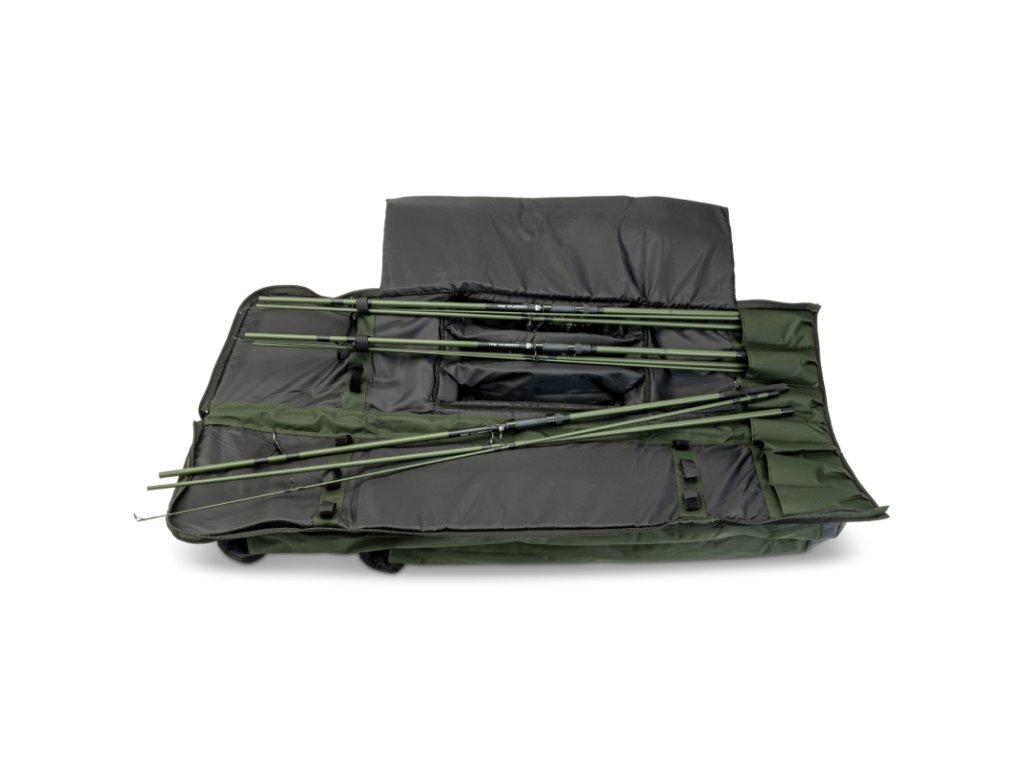 Anaconda 3 Section Holdall je ideální transportní systém pro třídílné pruty. Umožňuje pohodlné uložení 3 sestavených prutů (s navijáky do velikosti 14000) a 3 nesestavených prutů. Díky bočním kapsám nabízí dostatek prostoru i pro další rybářské potřeby, jako jsou feederové tubusy, vidličky, podběráky, deštníky a další nezbytnosti. Polstrovaný ramenní popruh, vysoce kvalitní zipy, voděodolný materiál a robustní polstrování jsou charakteristickými rysy tohoto obalu.