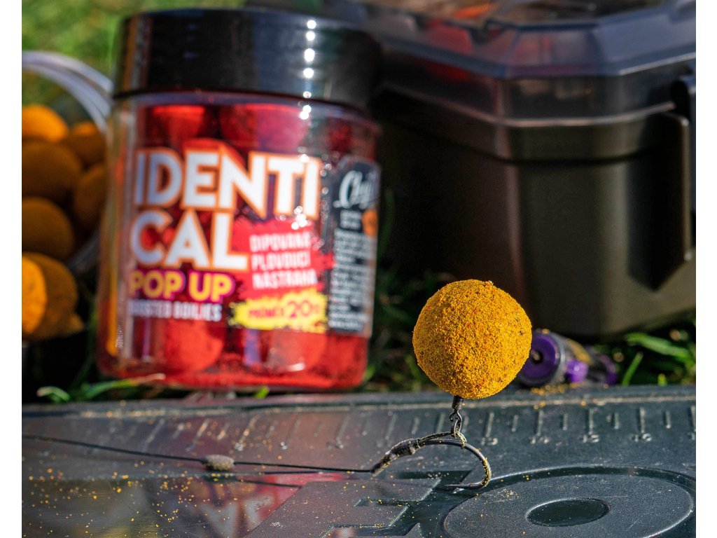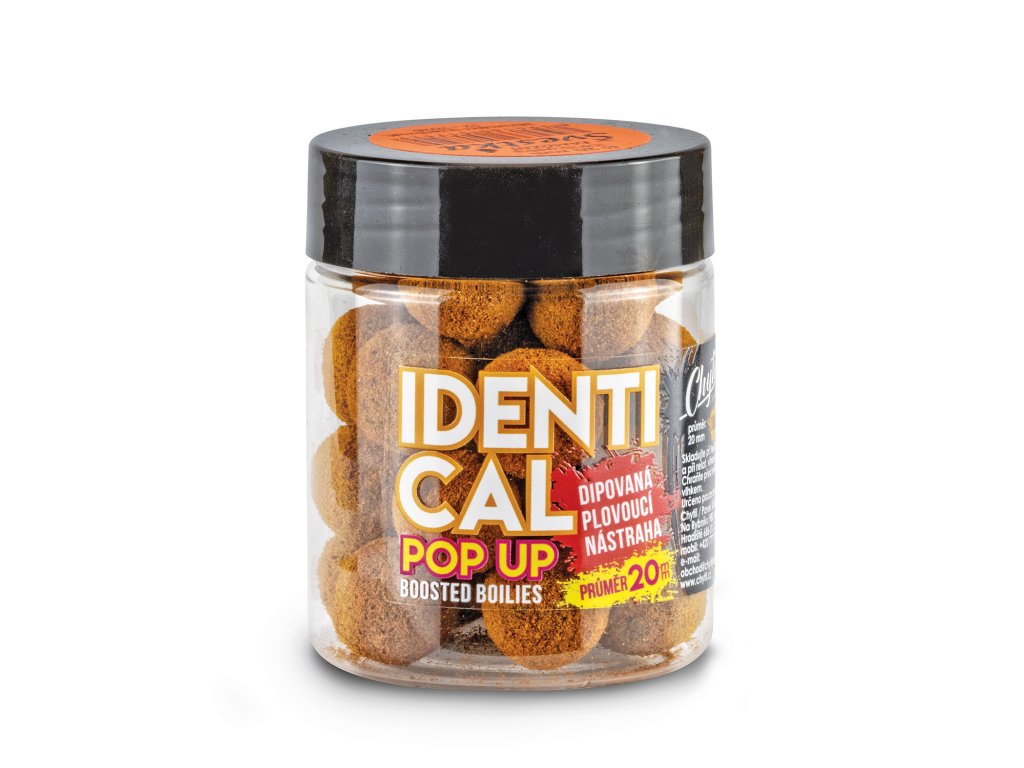 Jedinečný plovoucí boilies, jak svým složením, tak funkčností. Z názvu vyplývá, že je identický svým složením s boiliem naší nabídky. Základní směs na tento plovoucí boilies je totožná s tou, která se používá k výrobě našeho boilies. Totožné jsou také všechny tekuté suroviny (esence, esenciální oleje, extrakty, aminokyseliny, sladidla a další) jako u klasického boilies. Plovoucí složkou tohoto výrobku je korková drť, která je zde obsažena v takovém poměru, aby se IDENTICAL Pop-Up daly správně používat jak při samotném lovu na ně nebo k nastražení na panáčka.