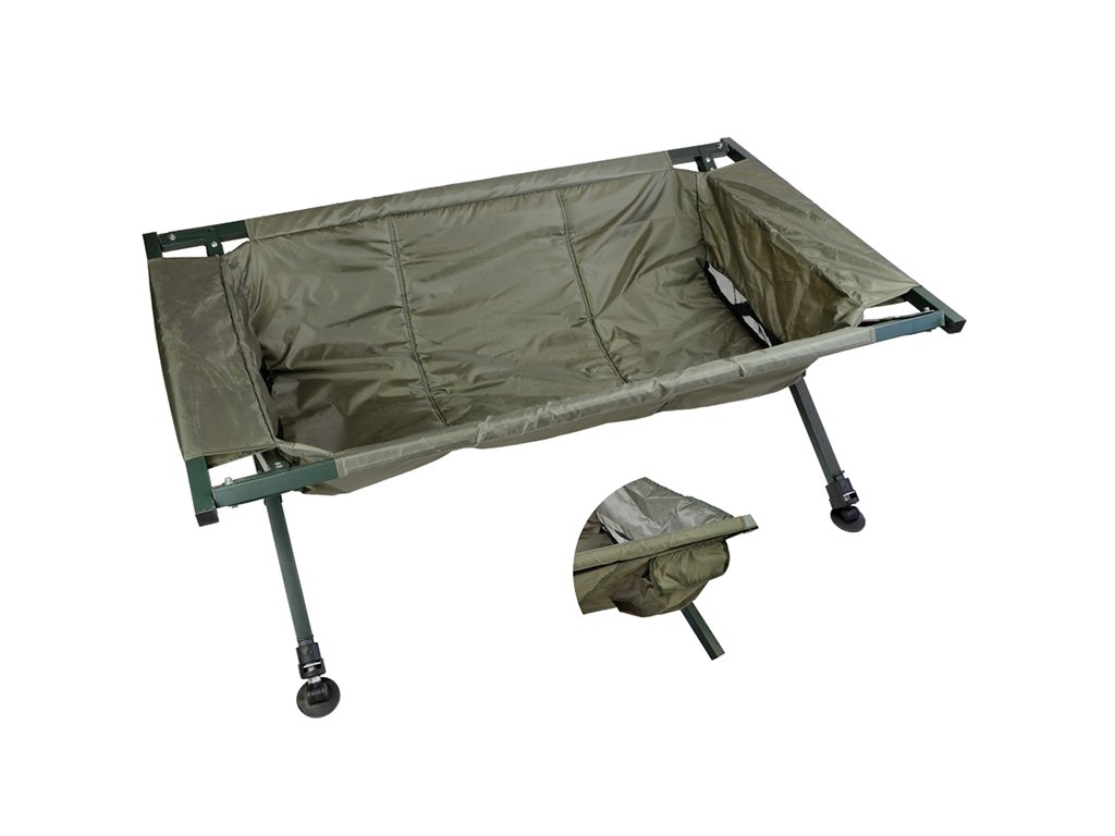 Všichni jistě znáte problémy s odháčkováním ryb. Ryba sebou neustále šije a občas hrozí, že Vám skončí háček v ruce. Proto je vhodné mít po ruce tuto čtyrnohou kolébku pod ryby. Je vyrobena z hliníku, proto má lehkou a pevnou konstrukci. V hluboké vaničce kolébky bude uvězněna téměř každá ryba bez šance uniknout. Proto ji můžete velice snadno odháčkovat. Ve vaničce kolébky jsou dvě postranní odtokové síťky, které dovolí vodě lehce odtéct. Díky tomu se Vám bude snadno s rybou pracovat. Čtyři nastavitelné nohy Vám zaručí stabilitu v jakémkoliv terénu. Spodní část nohou je možno posunout o 7 centimetrů, tím snadno vyrovnáte vaničku do stabilní polohy. Boční kapsa poskytuje dostatek prostoru pro uložení nástrojů, například pro odháčkování či měření. - Rozměry: 120 x 69 x 43 cm - Transportní rozměry : 120 x 24 x 15 cm Výrobce: Carp Zoom VideoDoplňkové parametry