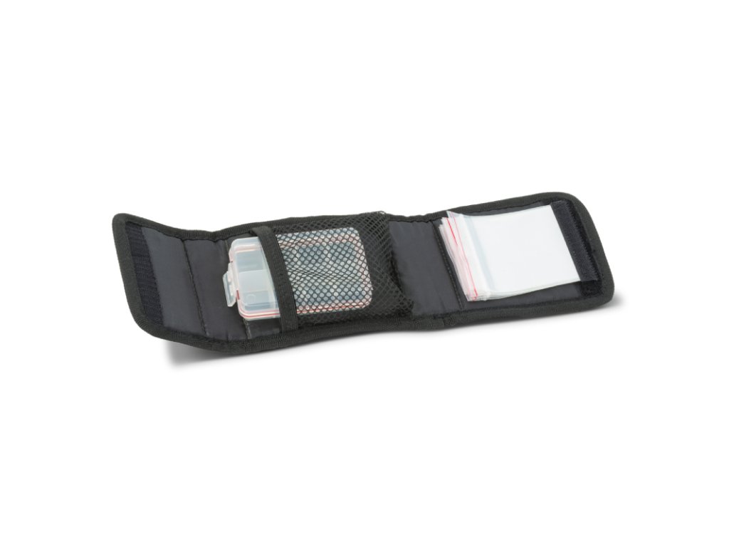 Pouzdro je vhodné například k uložení rotačních třpytek a dalších drobností. Ne jedné straně nalezněte 5 průhledných uzavíratelných pytlíků, na druhé krabičku, do které si můžete roztřídit potřebný drobnosti (obratlíky, háčky, olůvka…).