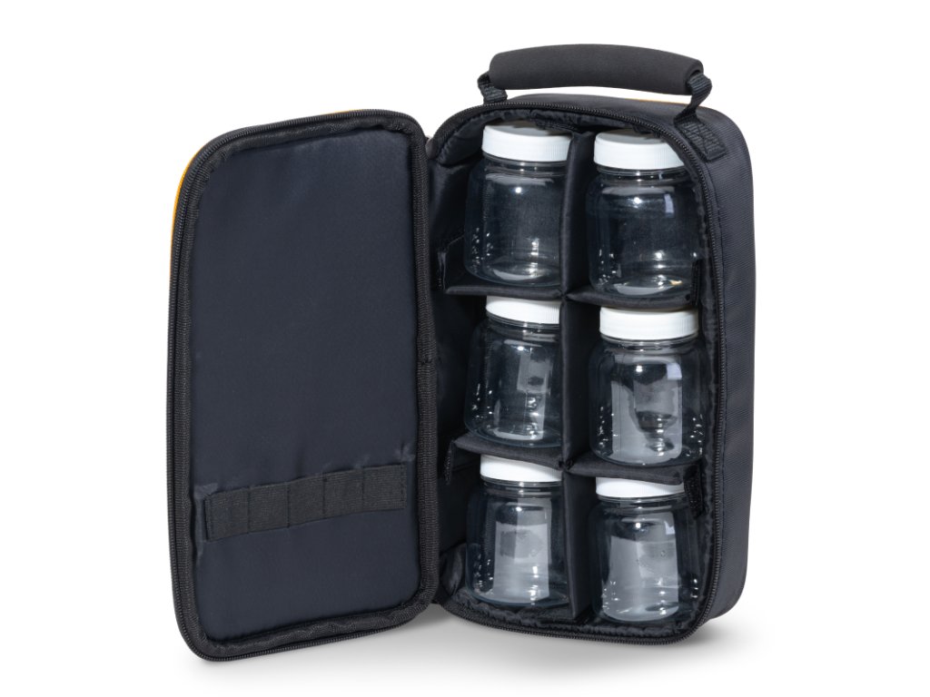 Jednoduché pouzdro s obvodovým zipem a šesti libovolně nastavitelnými přihrádkami. Ty se nastavují pomocí suchého zipu. V ceně je také šest plastových skleniček.