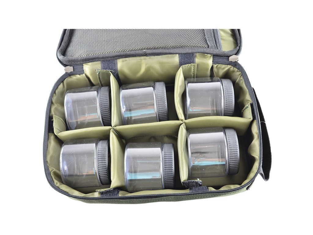 Taška se šesti přihrádkami a plastovými dózami na uchování a bezpečnou přepravu dipů. Vpředu s kapsami na zip pro menší příslušenství (jehly, PVA, atd.) Rozměry: 29 x 17 x 8 cm Výrobce: Carp ZoomDoplňkové parametry