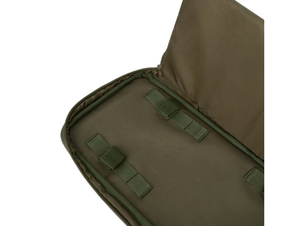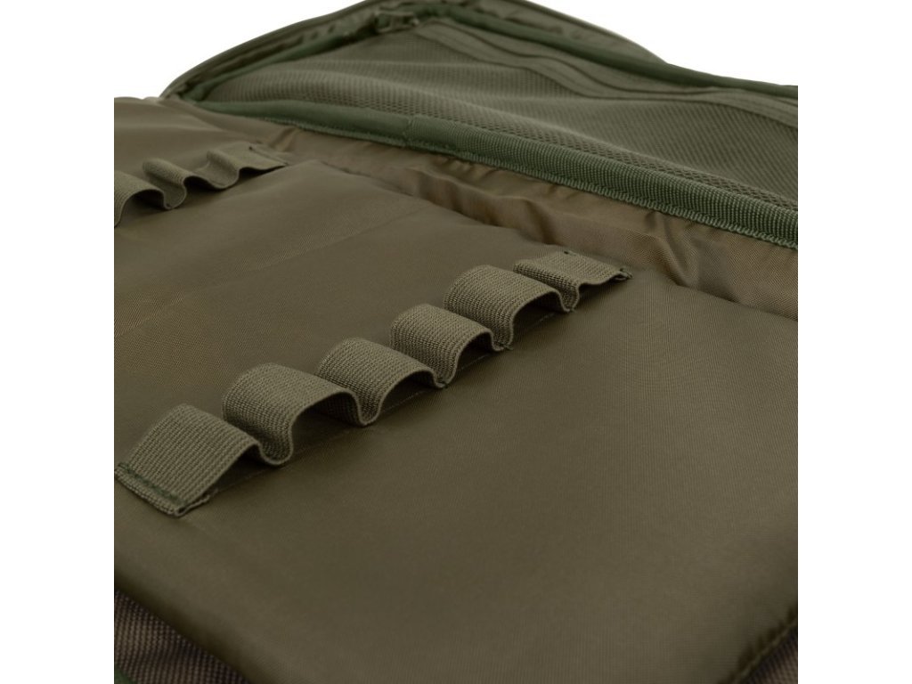 Pouzdro obsahuje vnitřní kapsu na zip pro uložení dalších nezbytností, jako jsou náhradní baterie nebo indikátory záběru. Uvnitř najdete nastavitelné popruhy pro upevnění různých velikostí hrazd. Vnitřní, ochranná část odděluje signalizátory od kapsy na příslušenství a na zadní straně na ní naleznete elastické smyčky pro uložení šesti vidliček.