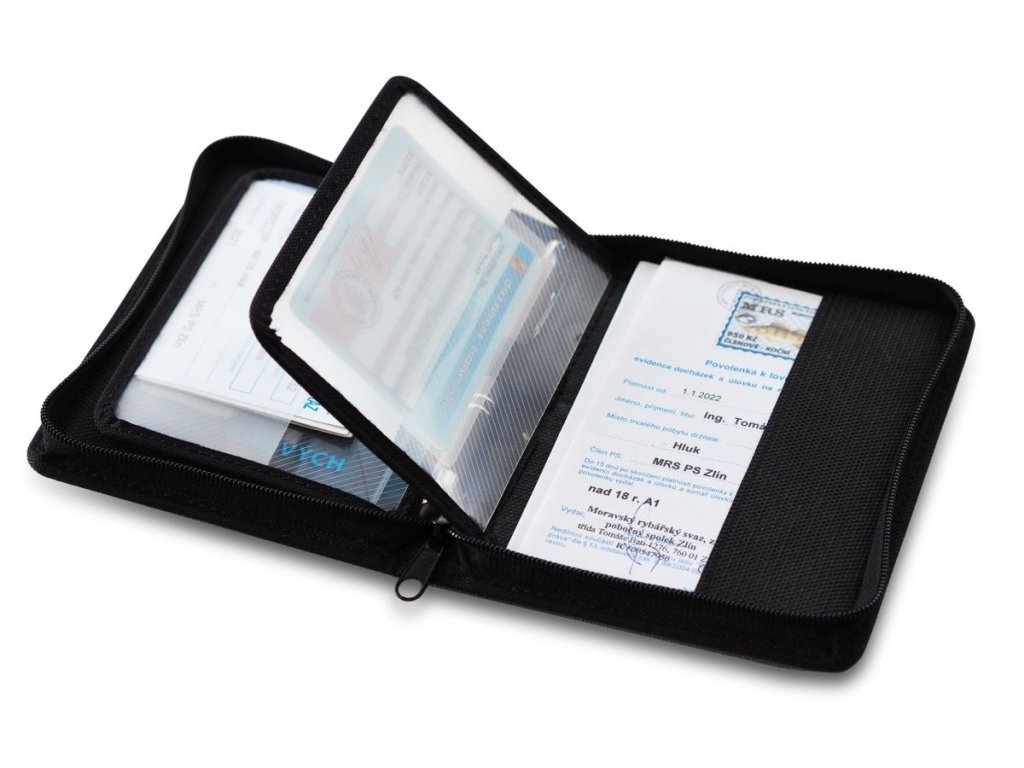 Po obou stranách pouzdra se nacházejí kapsičky pro vložení dokladů nebo rybářského řádu. Uprostřed pouzdra jsou dvě plastové přihrádky pro vložení členského průkazu, rybářského lístku, příručního kalendáře, sumáře a jiných drobných věcí. A nezapomněli jsme ani na gumový držák na pero. To vše je doplněno kvalitním zipem.