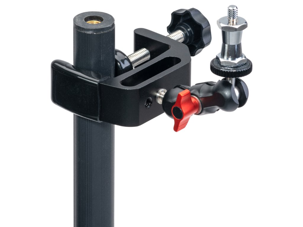 Adaptér s kulovou hlavou s vnějším závitem 3/8" kombinován se stabilní svorkou. Můžete rychle připevnit různé nástavce a adaptéry, které nabízejí široké možnosti rozšíření. Šířka otevření svorky, která je vyrobena z práškově lakované oceli, je cca 40 mm a nosnost cca 7,5 kg. Upínací plochy jsou samozřejmě pogumované a vhodné pro kulatý materiál i hranaté povrchy.