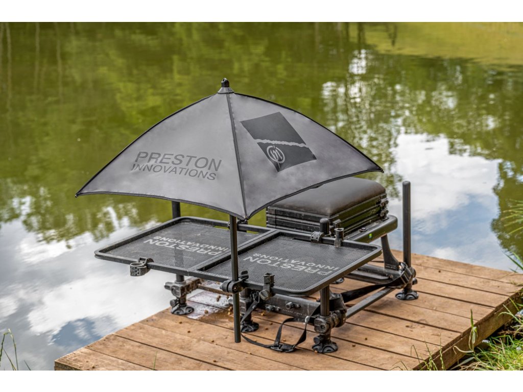 Dodáváno se speciálně vyvinutým držákem, který je kompatibilní s velkým množstvím stolků Preston. Dále je vybaven naklápěcím mechanismem, kdy můžete při kompletním vyšroubování deštník naklonit o 45° a zajistit tak pro své nástrahy stín i v situacích, kdy slunce svítí v ostřejším úhlu.