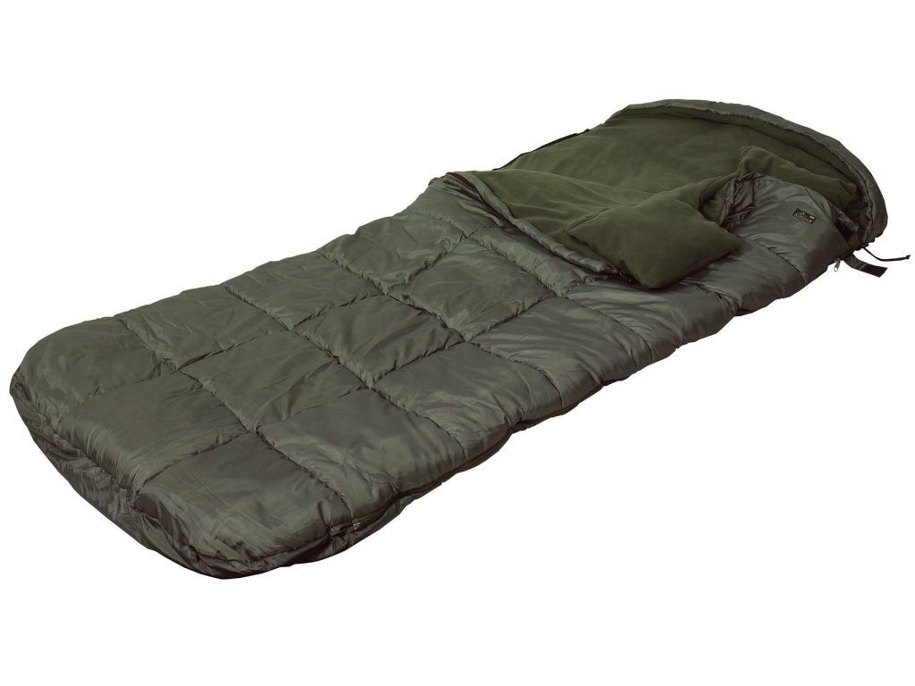 Popruh přišitý k zadní straně spacáku, vám umožňuje jeho pevné připevnění k lehátku. Na hlavové části a v nohách má lem, který se dá přetáhnout přes části lehátka a tím zajistit, že v noci nesklouznete, a i při rychlém vstávání k prutům jej neumažete od bláta. Spací pytel je testovaný v teplotách okolo -5 °C, takže se nemusíte bát vyrazit na ryby i v pozdním podzimu.