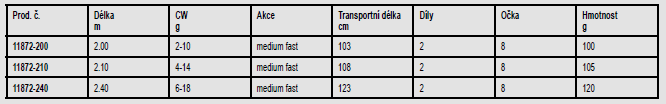 Délka prutu: 210 cm, Gramáž: 4-14 g, Počet dílů: 2, Počet oček: 8 ks, Skladnost prutu: 108 cm, Váha prutu: 105 g