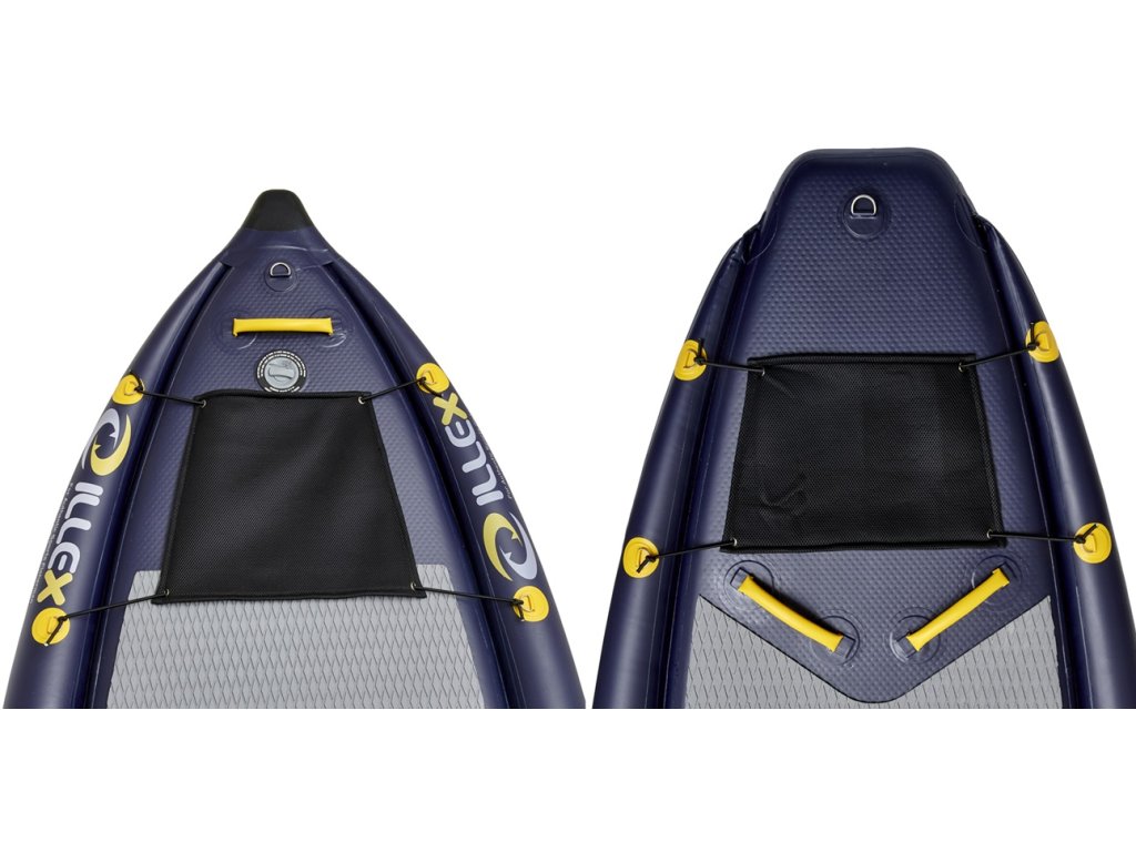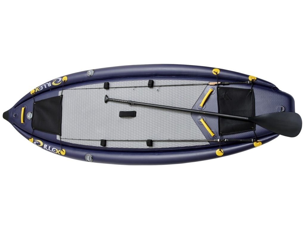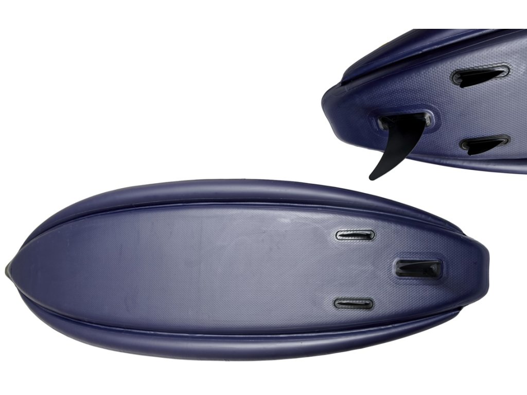 Obsahuje jednu hlavní nafukovací komoru ze silnostěnného dvouvrstvého materiálu potaženého PVC pro optimální pevnost s jedním bezpečnostním ventilem a protiskluzovým povrchem z EVA pěny o tloušťce 5 mm. Dále má dva nezávislé boční plováky, každý s bezpečnostním ventilem. Dvě sítě (jedna vpředu a jedna vzadu) slouží k přepravě tašek, nástrah a vybavení. Obsahuje také 10 D kroužků z odolné nerezové oceli pro libovolné uchycení výbavy. Na palubě jsou dále dva uchycovací pásky pro upevnění prutů nebo pádla. Stabilitě na vodě pomáhají dvě malé ploutve a jedna větší odnímatelná ploutev na spodní straně.