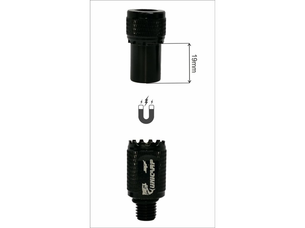 Perfektní adaptér pro připevnění šroubovacích koncovek, hlásičů a dalšího příslušenství na vidličky a stojany~Tento miniaturní, avšak precizně zpracovaný adaptér s prodlouženým zásuvníkem na 19 mm od značky ZICO - Unicarp je navržen tak, aby byl zcela bez vůlí a pevně seděl ve svém pouzdře, které je zašroubované ve vašem stojanu. Díky tomu je zajištěna maximální stabilita a pevnost při jeho použití.~~Adaptér využívá extrémně silné neodymové magnety nejvyšší kvality, které spolu s optimálně navrženou konstrukcí prodlouženého těla zajišťují výrazně stabilnější a pevnější rozebíratelný spoj než většina obdobných výrobků na trhu. Tato inovativní konstrukce umožňuje snadné a rychlé připojení a odpojení příslušenství, což ocení každý rybář při častém používání.~Navíc, díky své kompaktní velikosti a elegantnímu designu, je adaptér snadno přenosný a nenápadný, což ocení každý rybář, který si zakládá na kvalitním vybavení. S tímto adaptérem získáte nejen funkčnost, ale i estetiku, která doplní vaše rybářské vybavení.Doplňkové parametry