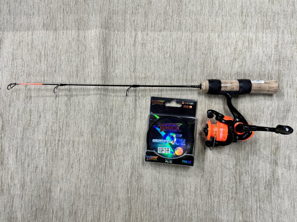 Sestava prutu stření akce o délce 50 cm a navijákem na dírky Norvi s vlascem ICE super průhledný 150 metrů, cíleně navržený k použití do studené vody Extreme ICE.