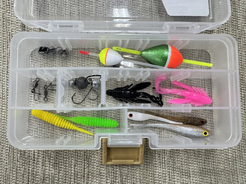 Jigové hlavičky Jig bez protihrotu, jigi s hrotem, podledové splávky dva kusy, broky, karabinky s obratlíkem, smáčky, nymfy, tanty..