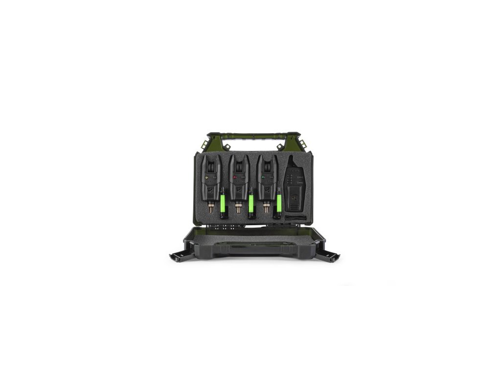 Tato sada obsahuje tři signalizátory záběru a bezdrátový příposlech. Tyto KBI signalizátory záběru jsou kompaktní, robustní a spolehlivé. Díky citlivosti kolečka, přes které vede vlasec a světelnou LED diodou, je fantastickou volbou pro všechny druhy rybaření. Reproduktor je vybaven nastavitelnou hlasitostí, zatímco LED dioda se může pochlubit funkcí, že svítí ještě 10 sekund po záběru. Přijímač má dalekosáhlý bezdrátový dosah, tlačítko na zapnutí / vypnutí a ovládání hlasitosti. Součástí balení jsou také tři zelené řetízkové swingery, vše hezky v jednom kompaktním balení.