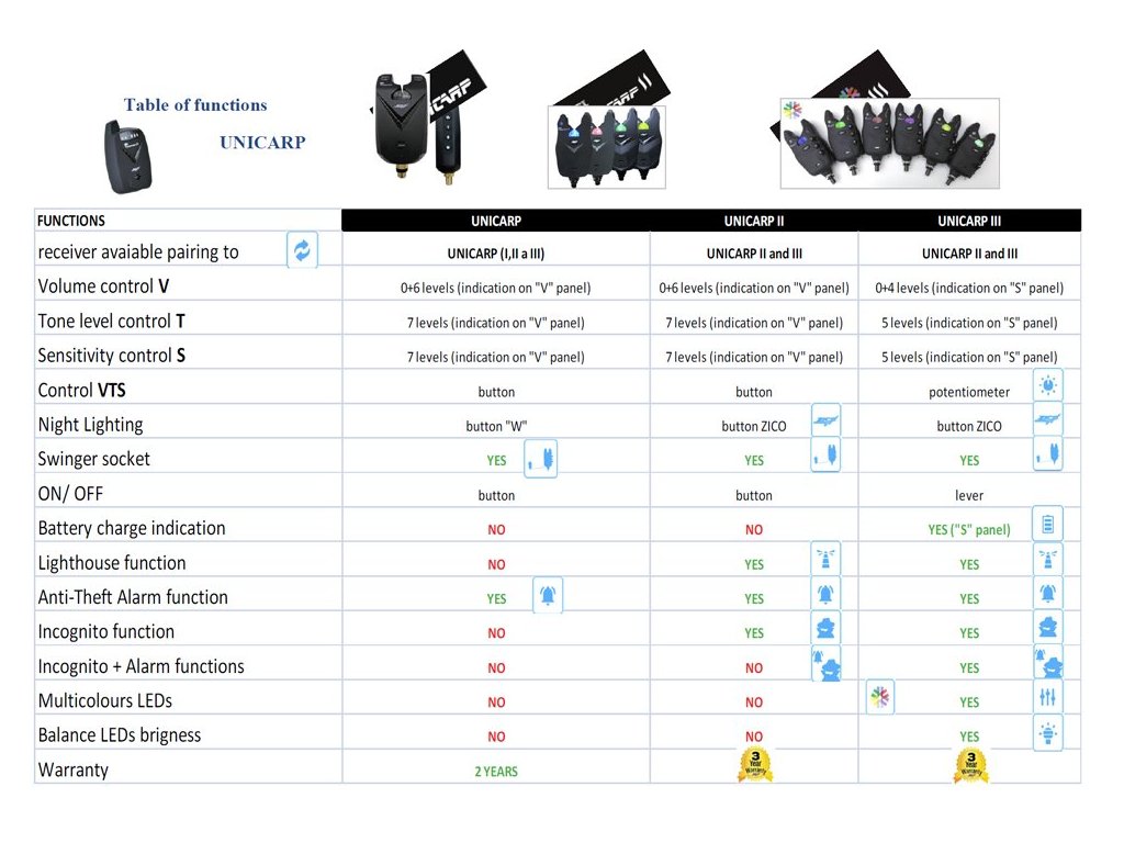 Nový model UNICARP II navazuje na úspěšnou řadu indikátorů UNICARP. Do jeho originálně řešeného, kompaktního a voděodolného těla byla vložena elektronika té nejlepší kvality. Dvojitá kontrola výroby nám dovoluje poskytnout tříletou záruku, což řadí tento výrobek do vyšší kategorie na trhu. Unicarp II disponuje nejen originálním vzhledem, ale řadou UNI-kátních funkcí reflektujících potřeby předních kaprařů, ale i obecné požadavky běžných rybářů např. funkce "Delay" 30s pro nastavení indikátorů; "Incognito" -indikace záběru pouze na přijímači; "Lighthouse" pro lokalizaci lovného místa při zavážení, "Alarm" proti krádeži prutů; "Drop back" funkce- zpětný záběr (padák) indikovaný "V" LED panelu a zvukem. Celé ovládání probíhá intuitivně tak jako u předchozího modelu. Pro přehlednost byl tento model vybaven pro zapnutí a vypnutí indikátoru a jeho modifikaci nočního osvětlení, rolničky a paměťové diody dalším tlačítkem - ZICO. Tímto se značně zjednodušila volba jednotlivých funkcí i při ztrátě návodu. Napájení je řešeno 9V baterií, která je volně dostupné ve většině obchodech, nicméně životnost baterie určuje používání indikátoru. (vzdálenost mezi indikátorem a přijímačem, používání přední zavážecí diody apod.) Na přijímač lze snadno napárovat až 6 indikátorů s unikátním kódováním. Jednotlivé indikátory Unicarp II lze párovat i na předchozí přijímač setů UNICARP (ID UNI 2 UNI 3) a to stejným způsobem. Dostupnost pro jednotlivé indikátory řady Unicarp II je docílena prodloužením antény v jeho těle a dosahuje více než 200m. Vice o jednotlivých funkcích se dočtete v návodu viz."přílohy ke zboží" Výrobek se dodává v kufírkových sadách 2+1 (červená + modrá; ID UNIC 2) nebo 3+1 (červená, modrá, zelená; ID UNIC 3) jednotlivě lze k přijímači dokoupit jednotlivé barvy indikátorů Unicarp II (k dispozici červená, modrá, zelená a žlutá; ID UNIC R-G-B-Y )~~Technické parametry Indikátoru:~- Digitální technologie řízená mikroprocesorem~- Regulace hlasitosti 0+6 úrovní~- Regulace tónu 7 úrovní tónu~- Regulace citlivosti 7 úrovní~- Vysoká viditelnost LED diod~- LED diody s 20 vteřinovou pamětí~- Pohotovostní režim LED diod, noční osvětlení~- Integrovaný výstup na swinger, snag s 20s pamětí~- Funkce "Delay" 30s pro nastavení indikátorů~- Funkce "Incognito" -indikace záběru pouze na přijímači ~- Funkce "Lighthouse" pro lokalizaci lovného místa při zavážení~- Funkce "Alarm" proti krádeži prutů~- "Drop back" funkce- zpětný záběr (padák) indikovaný "V" LED panelu a zvukem~- Černý mosazný šroub s aretací pootočením matice~- Voděodolné a pogumované tělo indikátoru~- Provozní frekvence pro bezdrátového vysílání: 433MHz~- Provozní napětí: 9V (baterie 9V je součástí výrobku)~-3 roky záruka~cena je za SADU 2 indikátory + pijimač UNICARP + kufírek ( baterie,popruh na krk, držák pijimače na opasek)~nezávislá recenze: https://www.mrk.cz/recenze/elektronika/sada_signalizatoru_zico_unicarp_ii/Doplňkové parametry