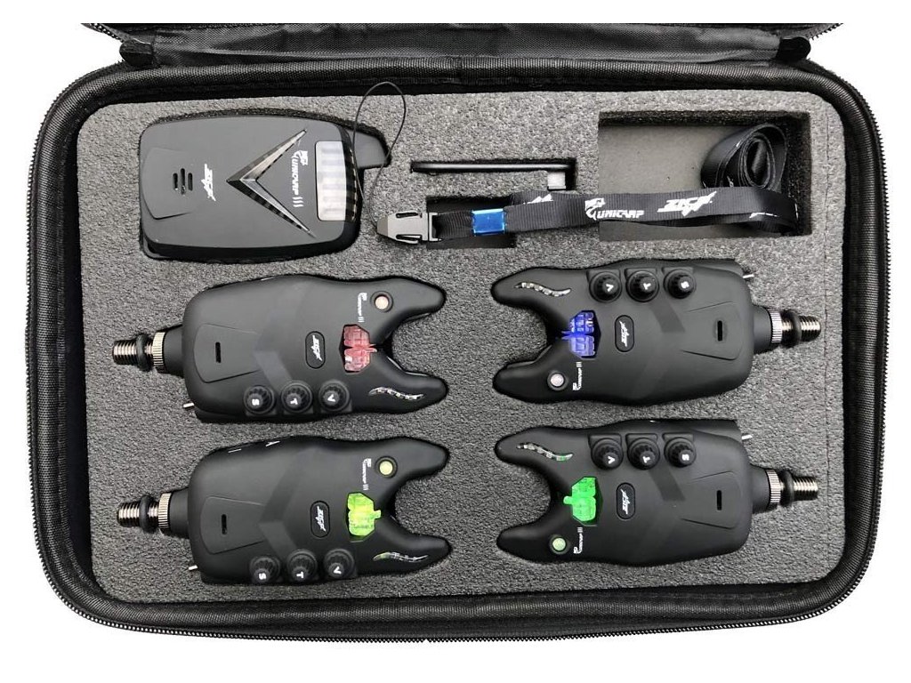 Sada v kufírku se čtyřmi indikátory UNICARP III a přijímač (4+1)+ zkušební baterie, popruh na krk, držák přijímače na opasek~~Nový model UNICARP III s možností volby barvy navazuje na úspěšnou řadu indikátorů UNICARP. Do jeho originálně řešeného, kompaktního a voděodolného těla byla vložena elektronika té nejlepší kvality. Dvojitá kontrola výroby nám dovoluje poskytnout tříletou záruku, což řadí tento výrobek do vyšší kategorie na trhu. Unicarp III disponuje nejen originálním vzhledem, ale řadou UNI-kátních funkcí reflektujících potřeby předních kaprařů, ale reguje i na obecné požadavky běžných rybářů např. funkce "Incognito" -indikace záběru pouze na přijímači; "Lighthouse" pro lokalizaci lovného místa při zavážení, "Alarm" proti krádeži prutů; "Drop back" funkce- zpětný záběr (padák) indikovaný na "S" LED panelu a zvukem. Celé ovládání probíhá intuitivně tak jako u předchozího modelu. Pro přehlednost byl tento model vybaven pro zapnutí a vypnutí indikátoru páčkou. Zapnutím do polohy ON na "S" panelu navíc zobrazuje podíl dílků aktuálního nabití 9V baterie. Regulace hlasitosti "V", tónu "T" a citlivosti "S" je volena klasickými potenciometry se zobrazením hodnoty na "S" panelu. Modifikace nočního osvětlení, rolničky, paměťové diody a majáku je ovládáno tlačítkem - ZICO. Tímto se značně zpřehlednila volba jednotlivých funkcí a je zcela intuitivní. Napájení je řešeno 9V baterií, která je volně dostupná ve většině obchodech, nicméně životnost baterie určuje používání indikátoru. (vzdálenost mezi indikátorem a přijímačem, používání přední zavážecí diody apod.) Na přijímač lze snadno napárovat až 6 indikátorů s unikátním kódováním. Jednotlivé indikátory Unicarp III lze párovat i na předchozí přijímač setů UNICARP (ID UNI 2, UNI 3, UNI 4) a rovněž na přijímač UNICARP II a to stejným jednoduchým způsobem. Dostupnost pro jednotlivé indikátory řady Unicarp III je docílena prodloužením antény v jeho těle a dosahuje více než 200m. Vice o jednotlivých funkcích se dočtete v návodu viz."přílohy ke zboží" Výrobek se také dodává v kufírkových sadách 2+1, 3+1, 4+1 výhodou Unicarpu III je, že nemusíte vybírat barvu do vašeho setu, jelikož na Unicarpu III lze libovolně přepínat barvy- poslední zvolená se uloží do nastavení se svojí pozicí kanálu na přijímači (max 6 barev: žlutá, zelená, modrá, červená, fialová, bílá) ~~Technické parametry Indikátoru:~- Digitální technologie řízená mikroprocesorem~- MC - multicolor~- Regulace hlasitosti 0+4 úrovně~- Regulace tónu 5 úrovní tónu~- Regulace citlivosti 5 úrovní~- Vysoká viditelnost LED diod, s možností volby jasu~- LED diody s 20 vteřinovou pamětí~- Pohotovostní režim LED diod, noční osvětlení~- Integrovaný výstup na swinger, snag s 20s pamětí~- Funkce "Incognito" -indikace záběru pouze na přijímači ~- Funkce "Alarm" proti krádeži prutů~- Funkce "Incognito" a "Alarm" současně~- Funkce "Lighthouse" pro lokalizaci lovného místa při zavážení~- Indikace nabití baterie po zapnutí indikátoru~- "Drop back" funkce- zpětný záběr (padák) indikovaný na "S" LED panelu a zvukem~- Black chrom šroub s aretací pozice silnou gumičkou~- Voděodolné a pogumované tělo indikátoru~- Provozní frekvence pro bezdrátového vysílání: 433MHz, dosah 200m~- Provozní napětí: 9V (zkušební baterie 9V je součástí výrobku)~~3 roky záruka~~Produktový list: https://www.zico.cz/unicarpIII~~nezávislá recenze: https://www.mrk.cz/recenze/elektronika/sada_signalizatoru_zico_unicarp_iii/Doplňkové parametry