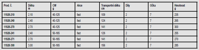 Délka prutu: 240 cm, Gramáž: 50-165 g, Počet dílů: 2, Počet oček: 7 ks, Skladnost prutu: 126 cm, Váha prutu: 255 g