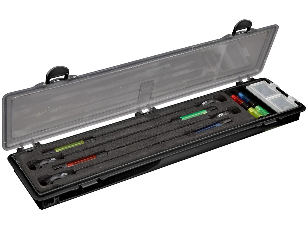 Sada obsahuje: 4x řetízkový swinger D-TEC Black out 16 g mix (červený, zelený, žlutý, modrý), 4x náhradní krátkou hlavu mix (červená, zelená, žlutá, modrá), transportní box, přídavné 5 g závaží.