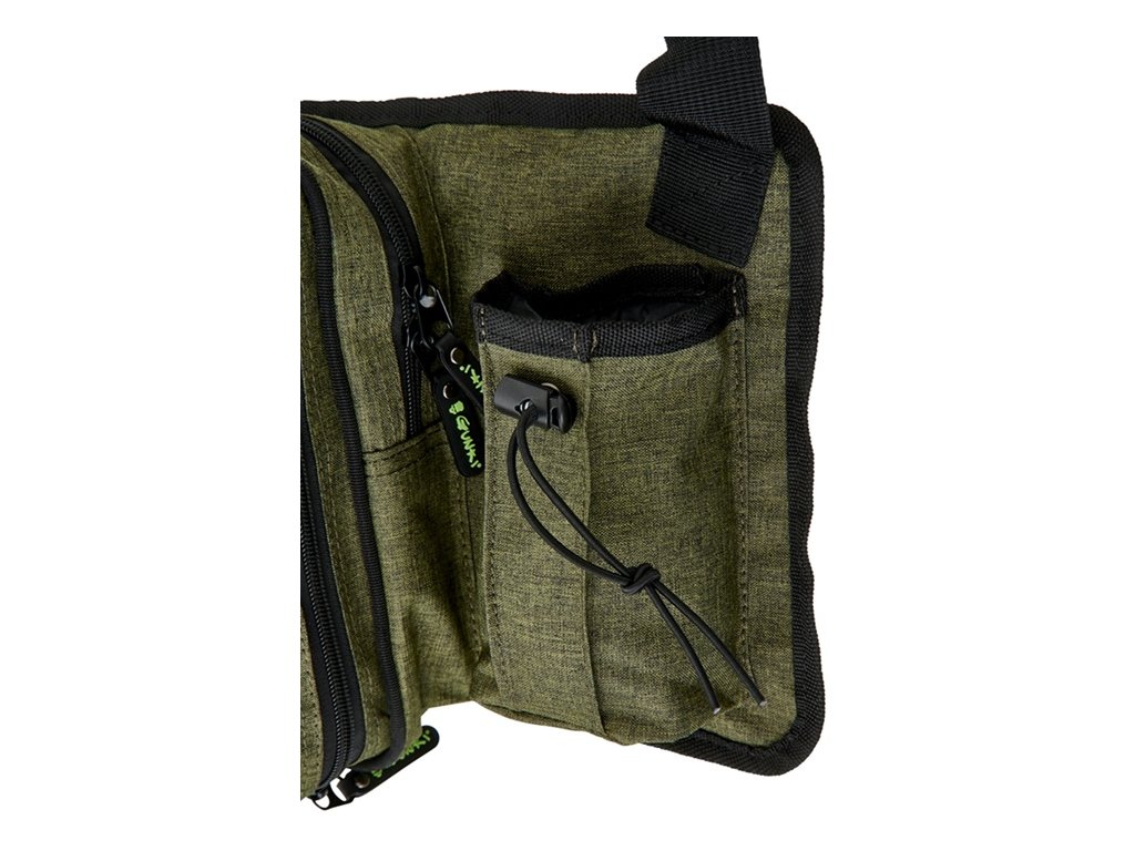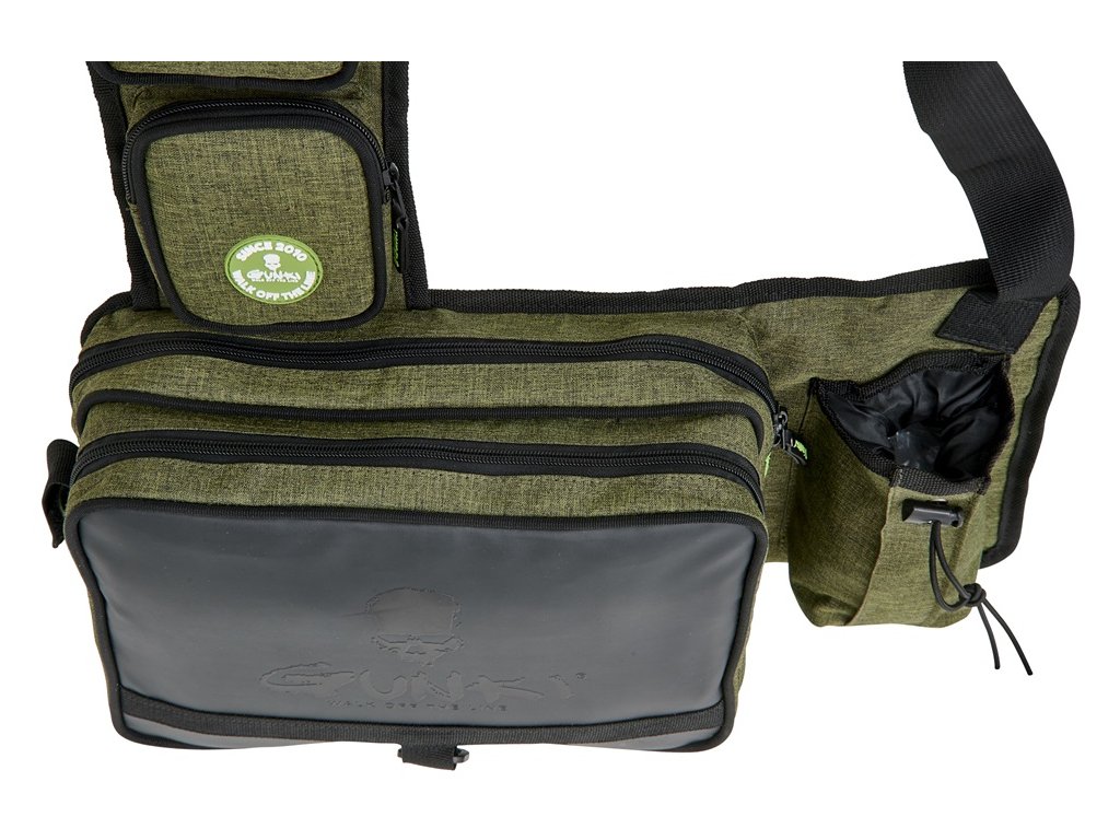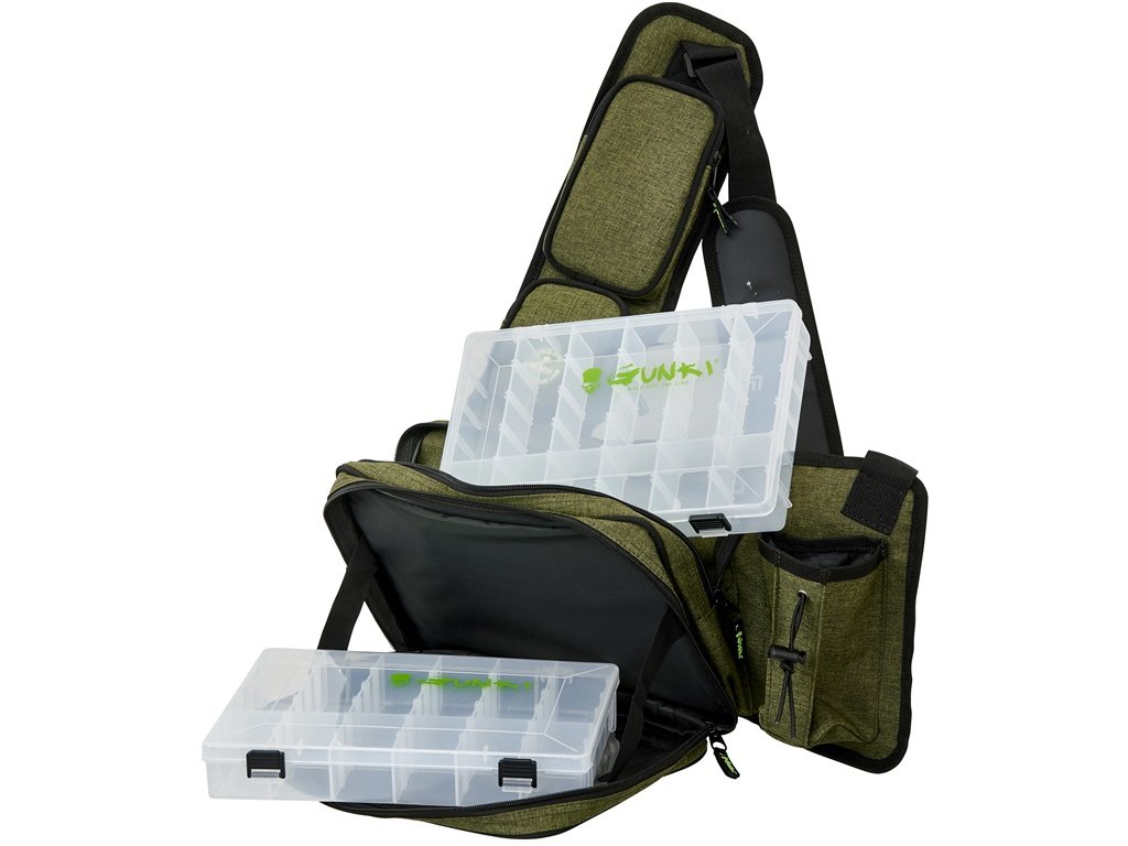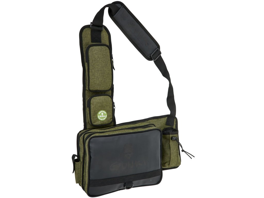 Lehký batůžek přes jedno rameno s nastavitelným polstrovaným popruhem pro rychlé vláčecí vycházky. Obsahuje dvě hlavní komory na zip, dvě menší kapsy na zip, držák kleští a kapsu na pití. Součástí je i D kroužek na další vybavení. Součástí jsou i dvě krabičky na nástrahy 27,5x19,5x45 cm. Pevná odolná tkanina je doplněná o kvalitní zipy. To vše v Gunki designu. Rozměr: 45x22x10 cm.