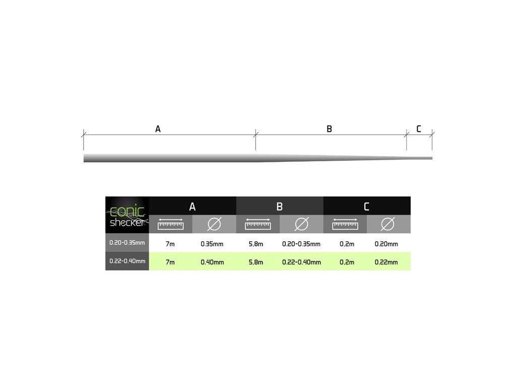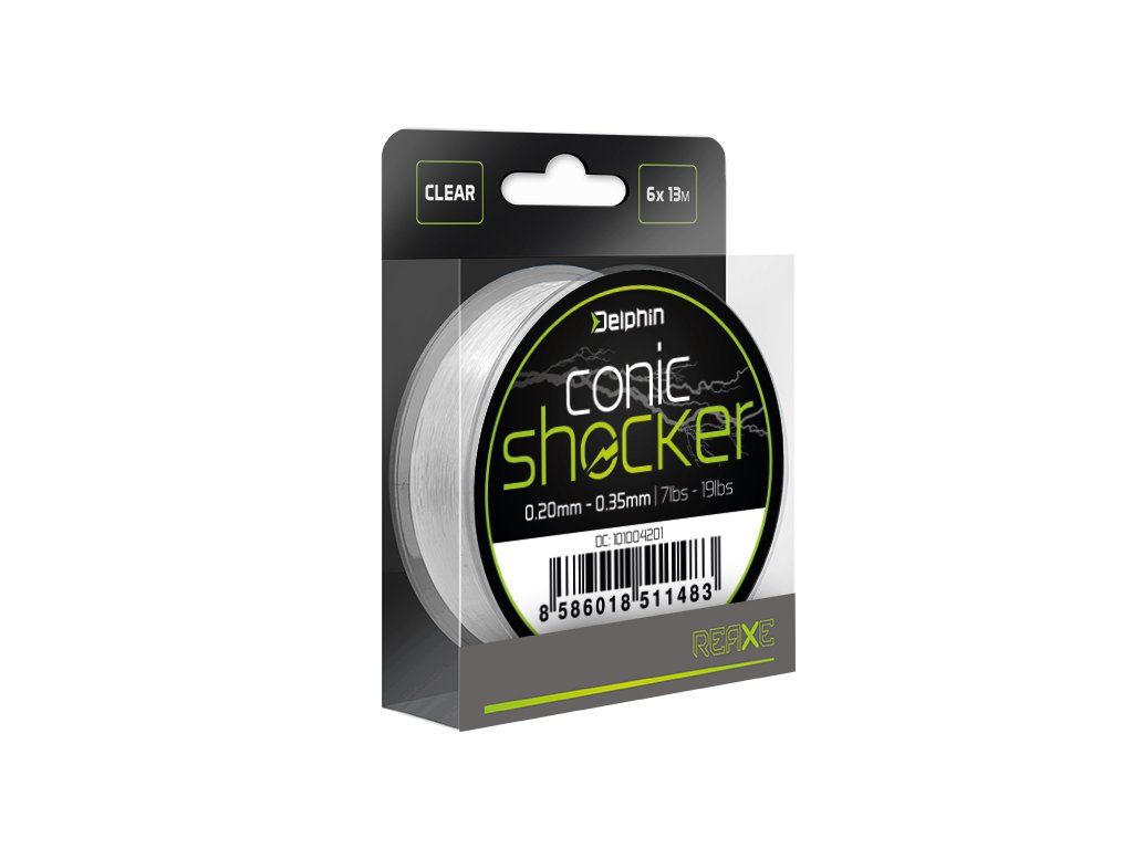 Delphin Conic SHOCKER REAXE je kónický šokový vlasec, díky kterému nahazování na velké vzdálenosti nabývá nového rozměru! Pod označením REAXE se ukrývají průměry speciálně určené pro feederový či method feederový lov. Podstata kónicky zúženého vlasce spočívá v postupně se měnícím průměru, díky čemuž je možné spojit jej s kmenovým vlascem pomocí velmi malého uzlíku. Právě to je jedním z klíčových parametrů pro mnohem snazší odvíjení vlasce z cívky a pro hladký průchod očky. Na opačném konci je však dostatečně tlustý a pevný, aby bez problémů odolal překážkám pod vodní hladinou či výpadům velkých ryb. Zároveň se do prutu můžete opřít plnou parou, bez obav o odtržení koncové sestavy při krátkodobém přetížení během nahazování. Kombinace zmíněných faktorů zaručuje, že při nahazování budete schopni dopravit své montáže podstatně dále než při použití klasické „šokovky“ se stejným průměrem po celé délce. V balení na cívce se nachází navinutých 6 kusů návazců o délce 13 metrů, které jsou vždy označeny nálepkou.Doplňkové parametry